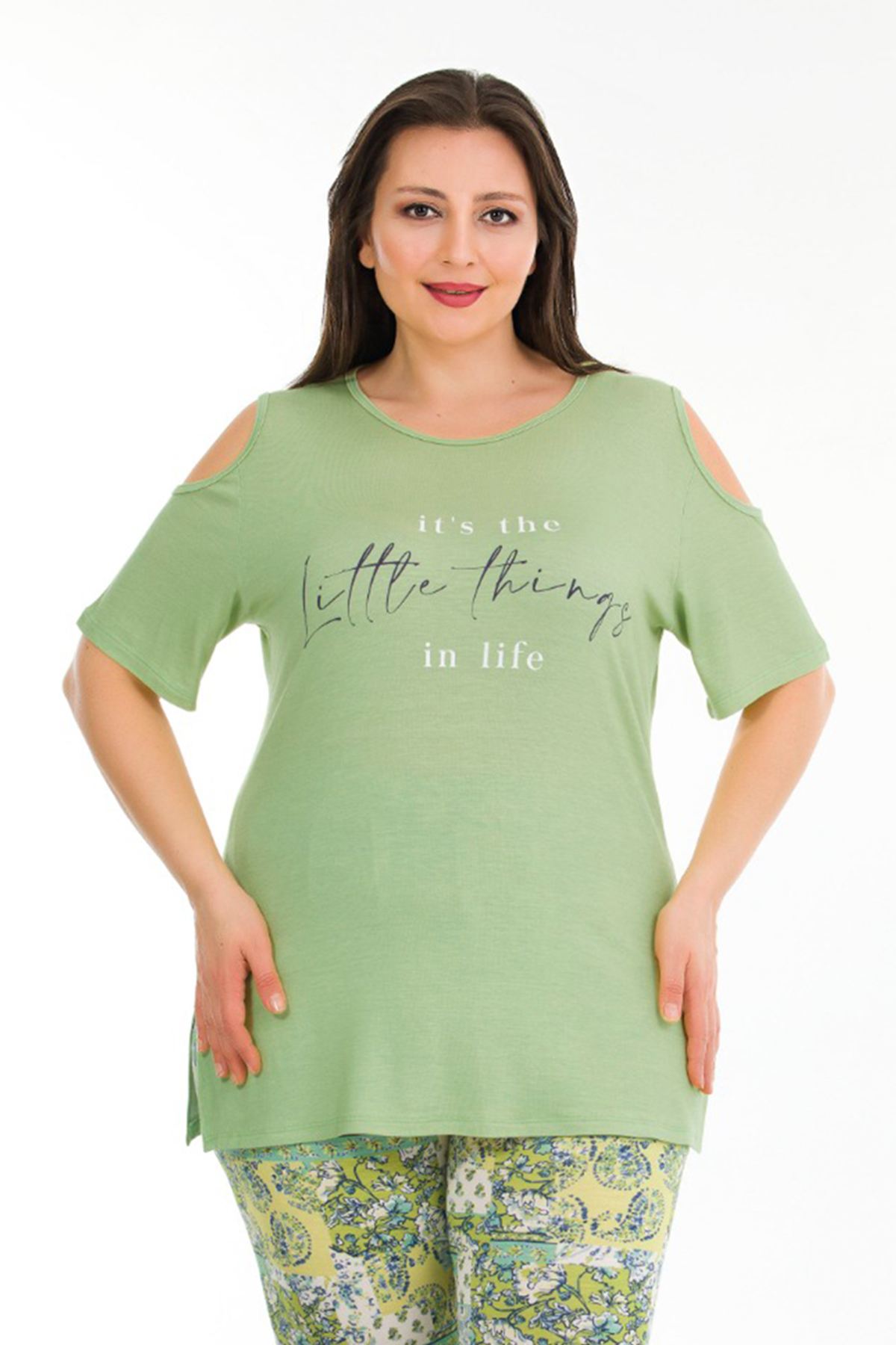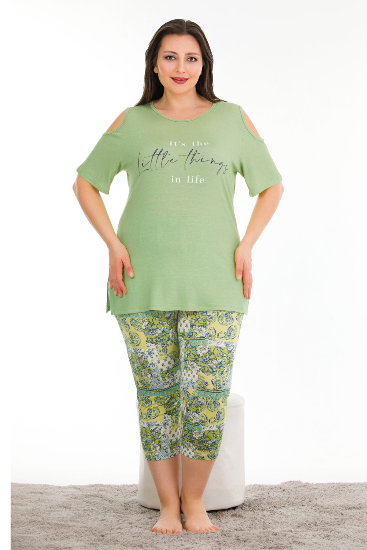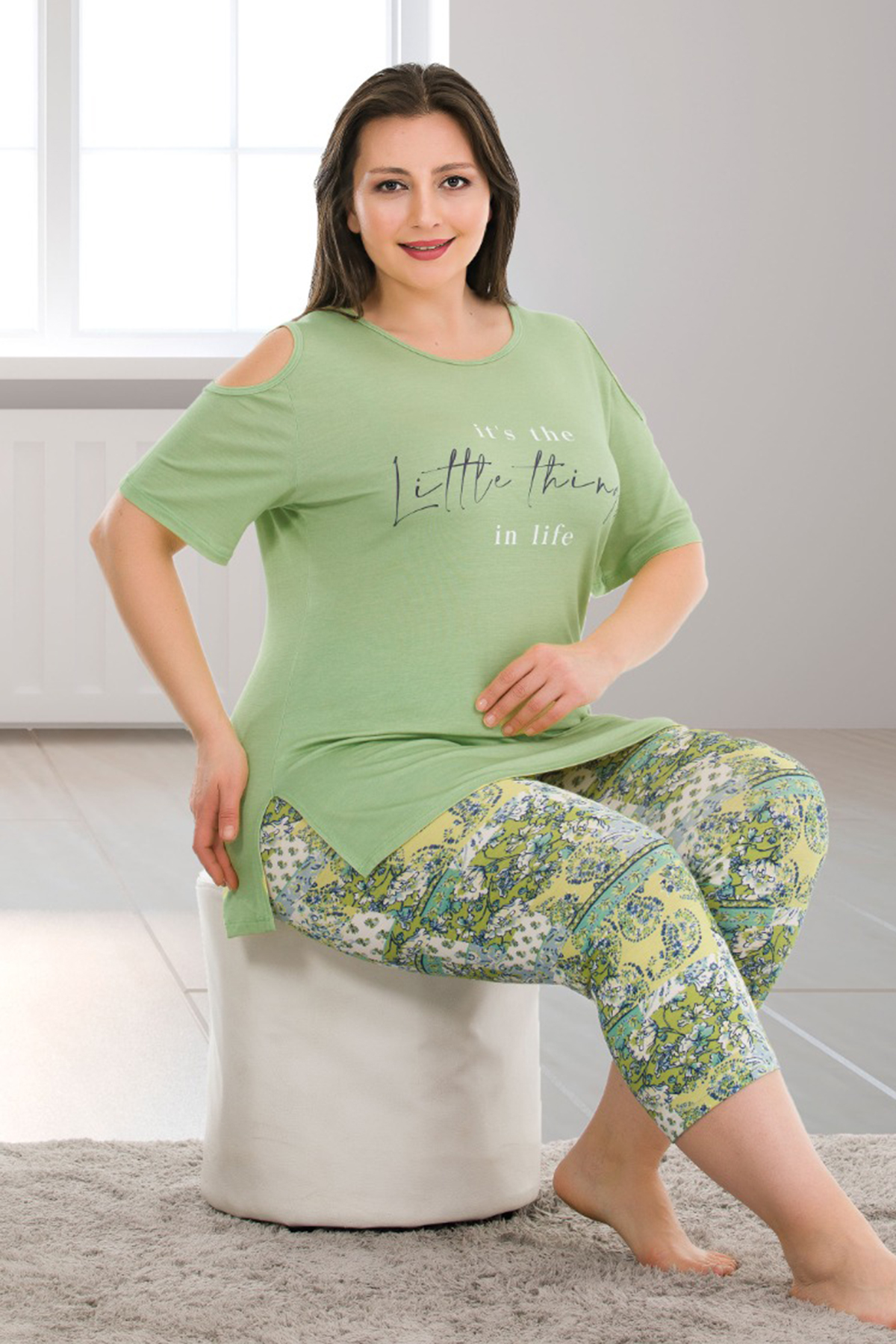 Yeşil Renk ve Çiçek Desenli Lady 10678 Büyük Beden Kapri Pijama Takımı