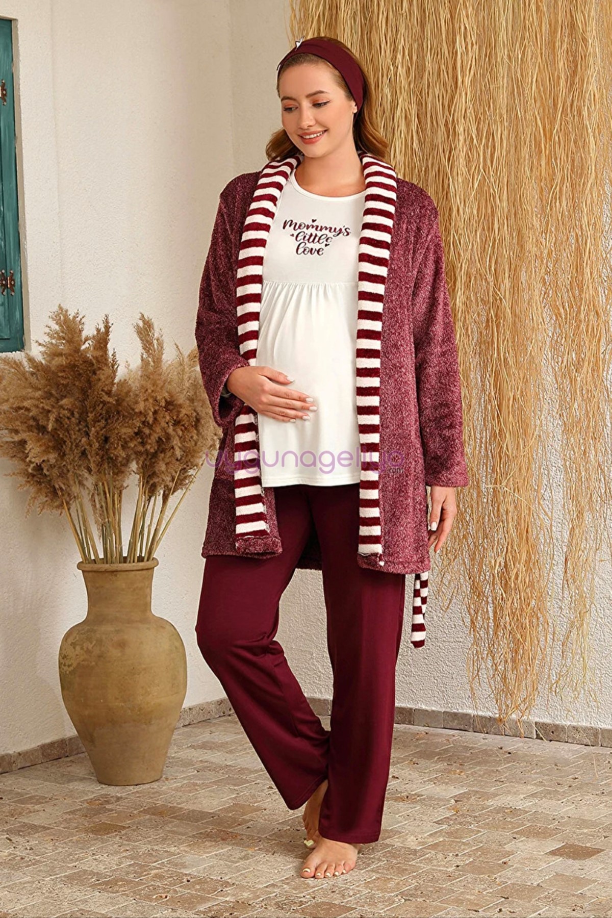 Bordo Renk BAHA 4419 Uzun Kol 3'lü ve Wellsoft Sabahlıklı Hamile Pijama Takım Set