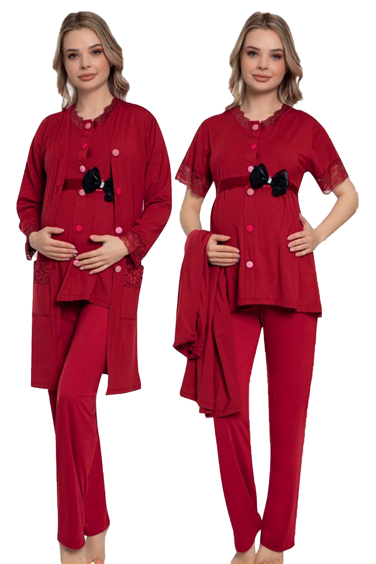 3 Parça Sabahlıklı Hamile Pijama Takımı - Bordo Renkli Kısa ..