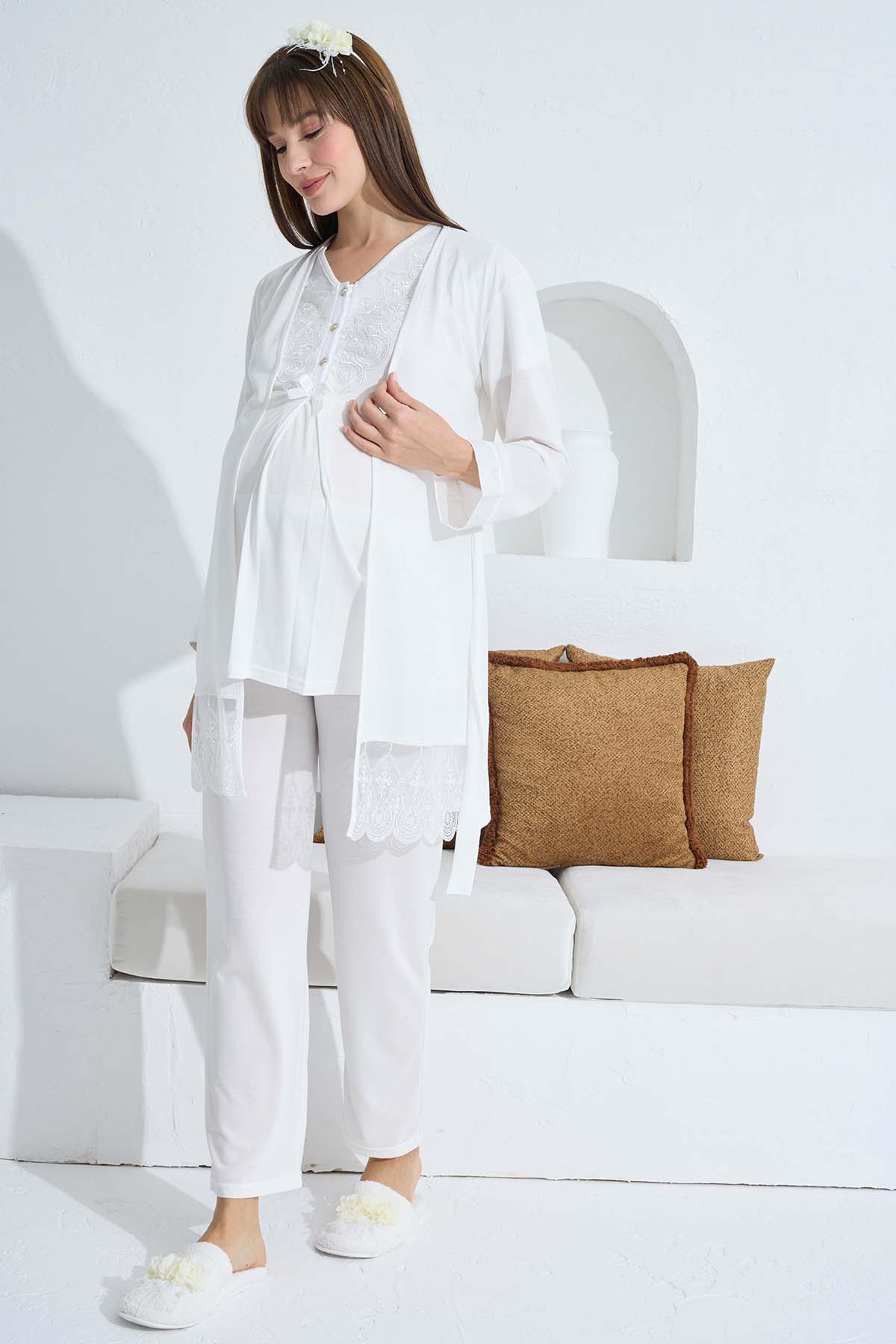 Ekru Renk Erdeniz 3383 Kısa Kol Dantel Detaylı 3 lü ve Sabahlıklı Hamile Pijama Takımı
