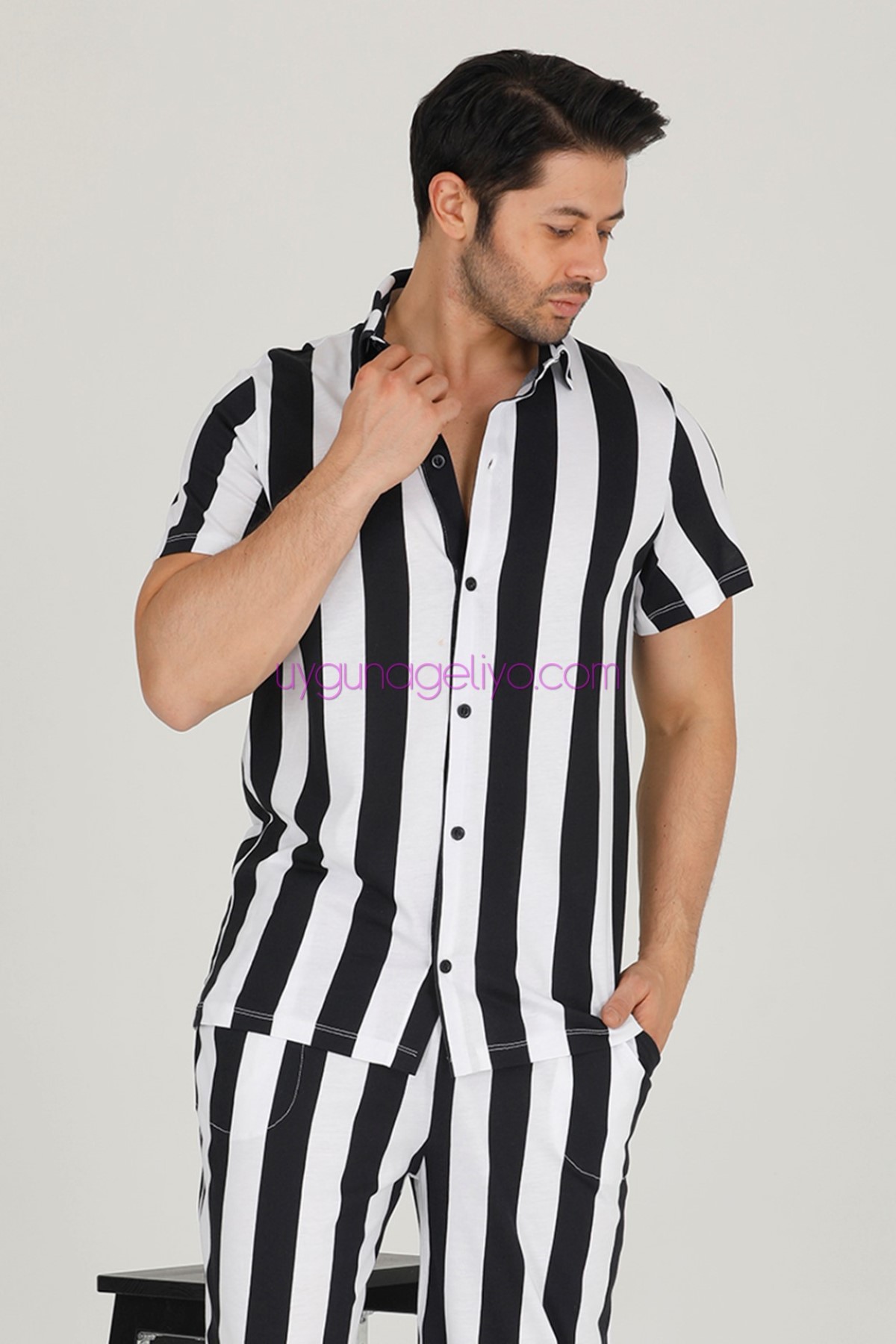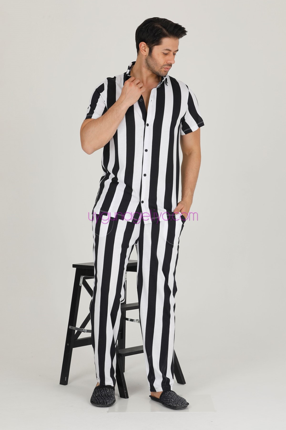 Siyah - Beyaz Renkli Çizgili Teknur 31502 Modal Kumaş Erkek Kısa Kol Pijama Takımı