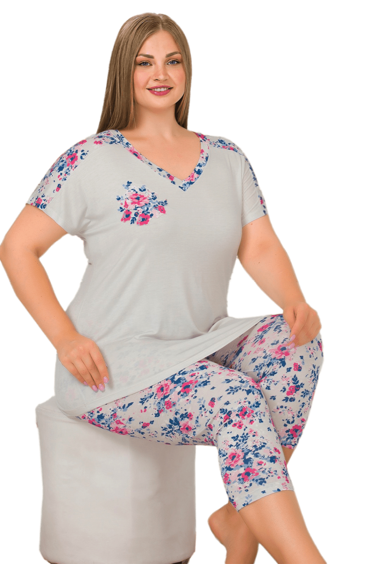 Gri Renk ve Çiçek Desenli Lady 10649 Büyük Beden Kapri Pijama Takımı