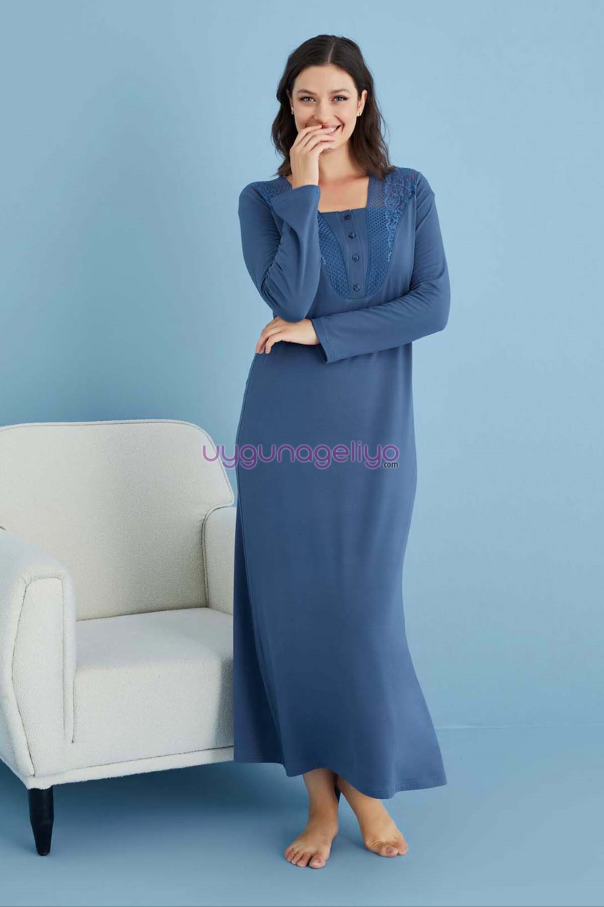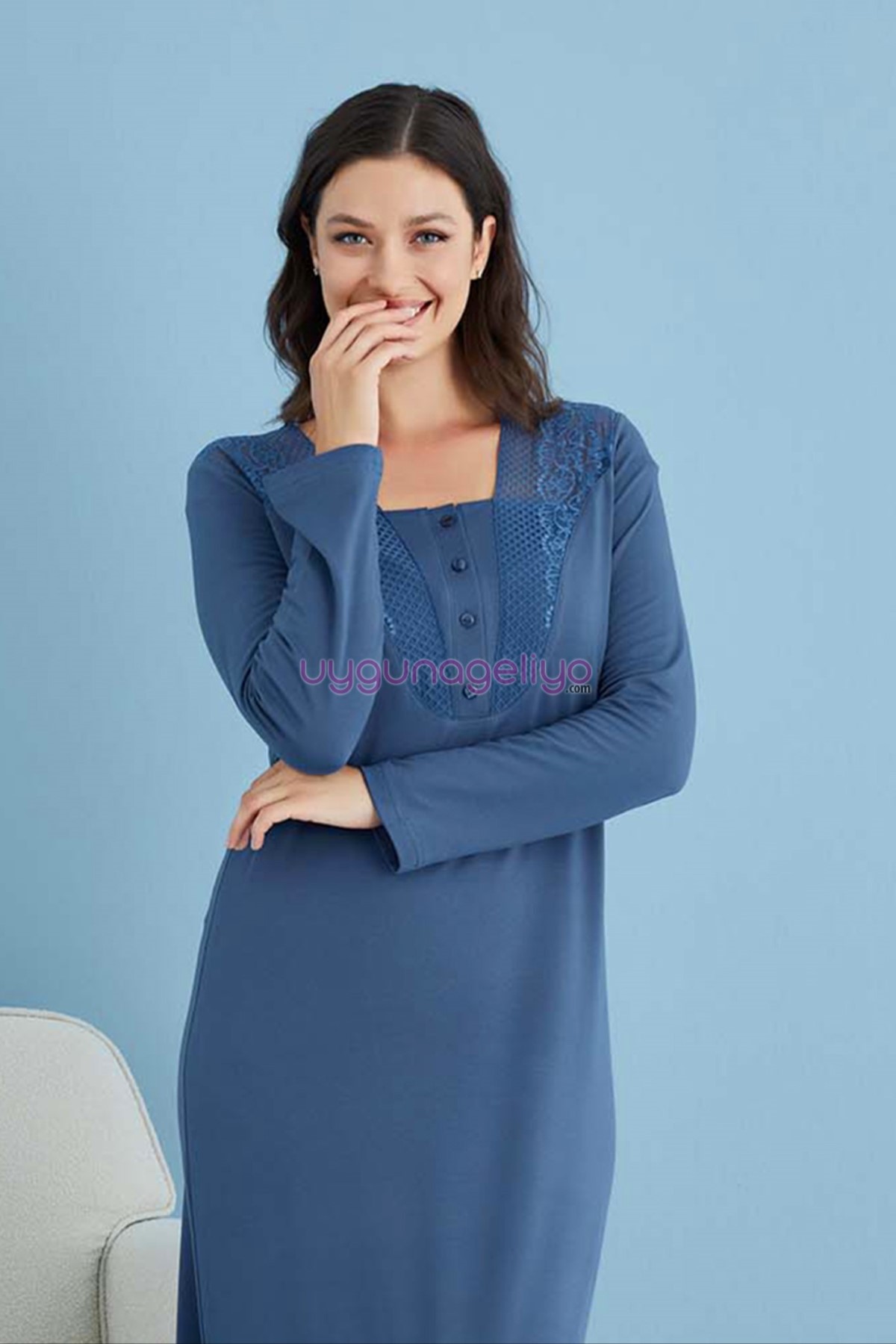 İndigo Renk Tuba 23452 Uzun Kol Dantel Detaylı 2li ve Sabahlıklı Hamile Gecelik Takım Set