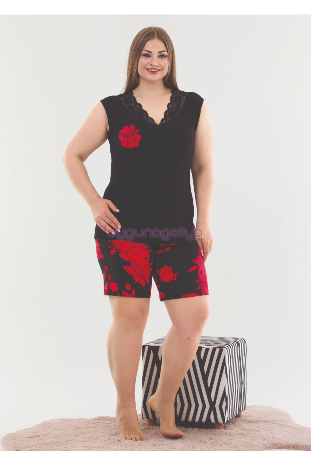 Siyah Renk ve Çiçek Desenli Lady 10372 Büyük Beden Battal Boy Şortlu Pijama Takım