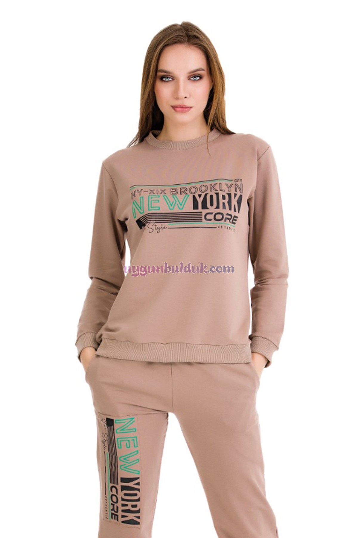 Kahverengi Uzun Kollu Lady 22023 Cepli ve Bisiklet Yakalı Kadın Spor Eşofman Takımı