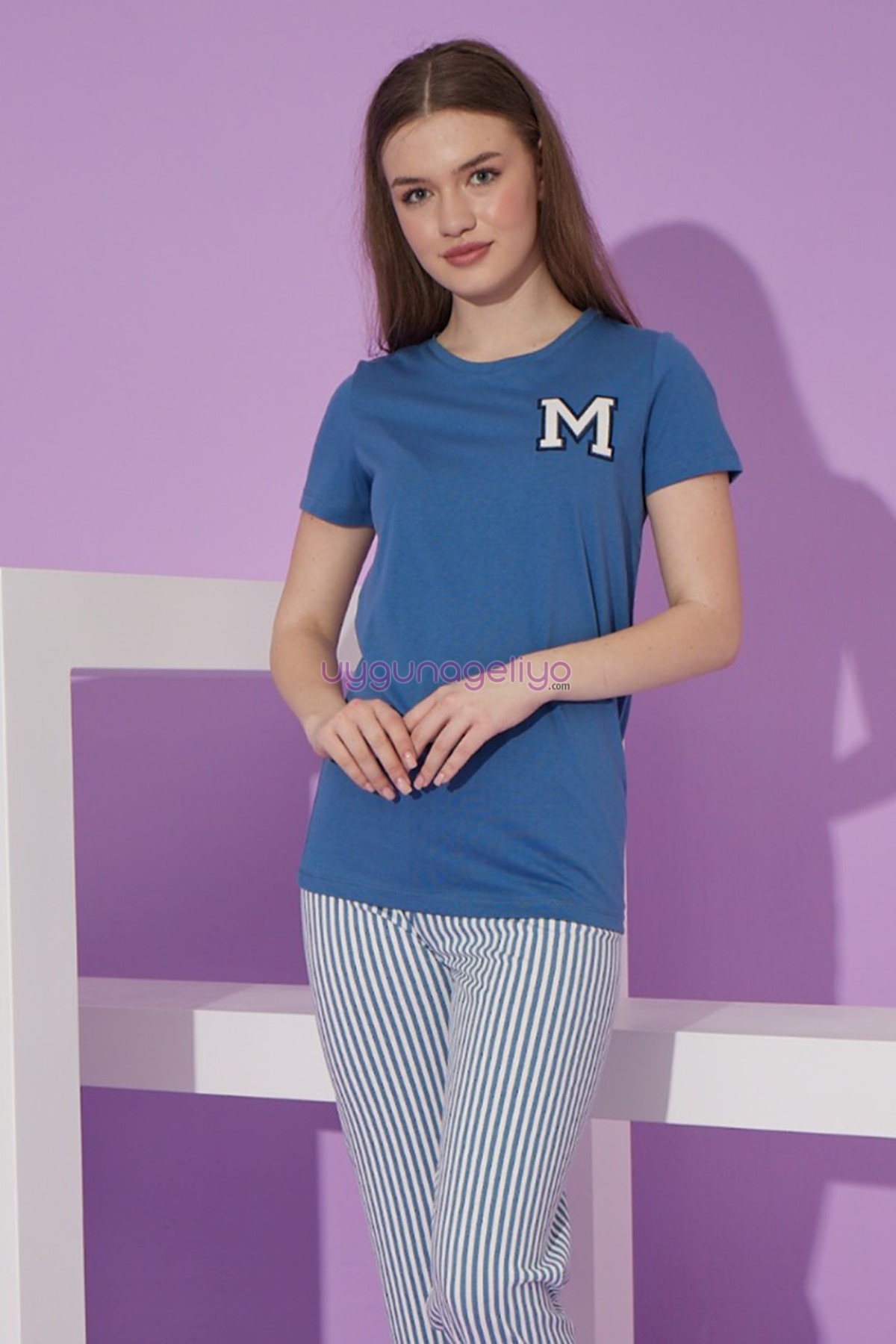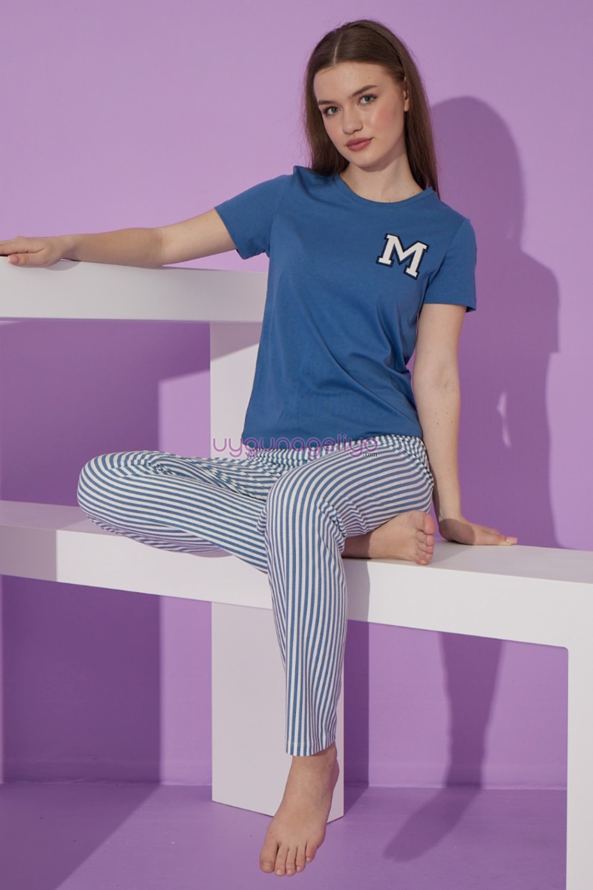 Mavi Renk ve Çizgili Desen Teknur 76105 Kısa Kol Modal Kumaş Kadın Pijama Takımı