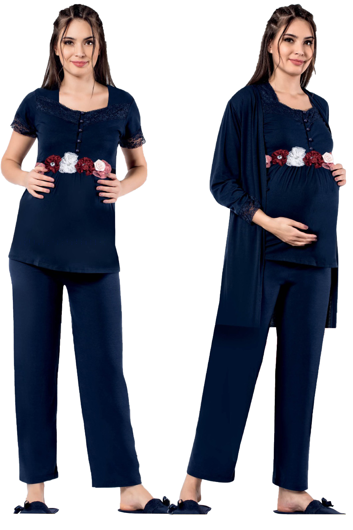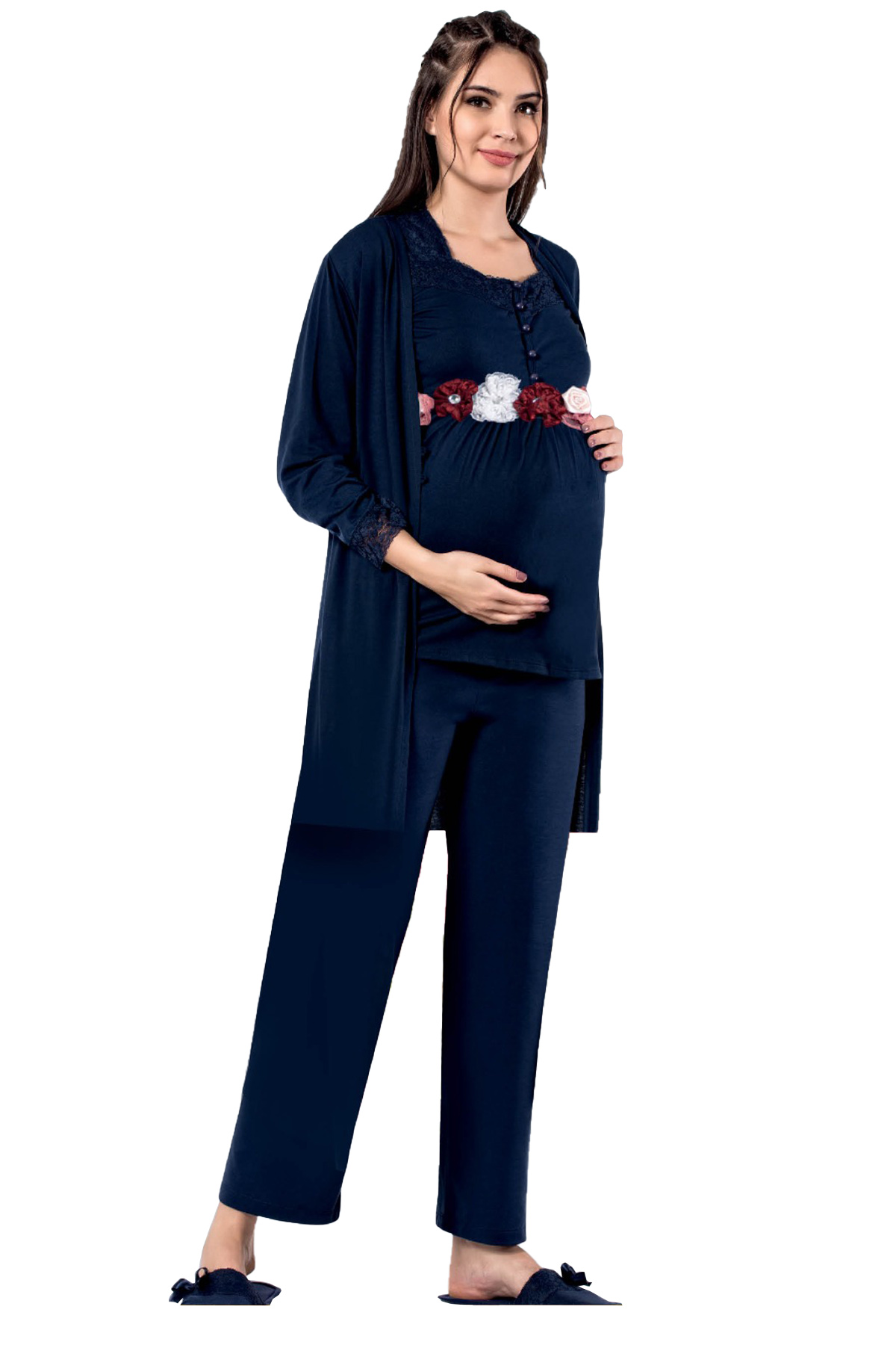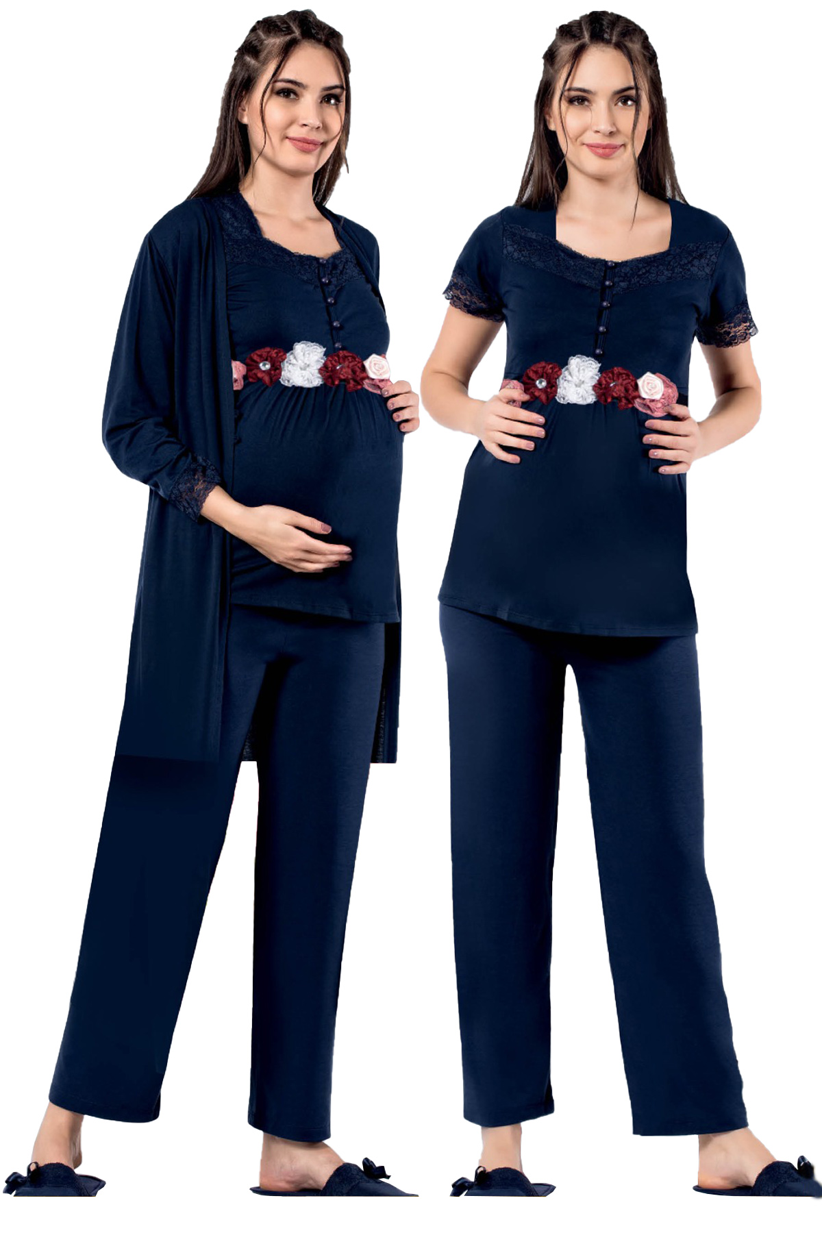 3 Parça Sabahlıklı Hamile Pijama Takımı - Lacivert Renkli Kı..