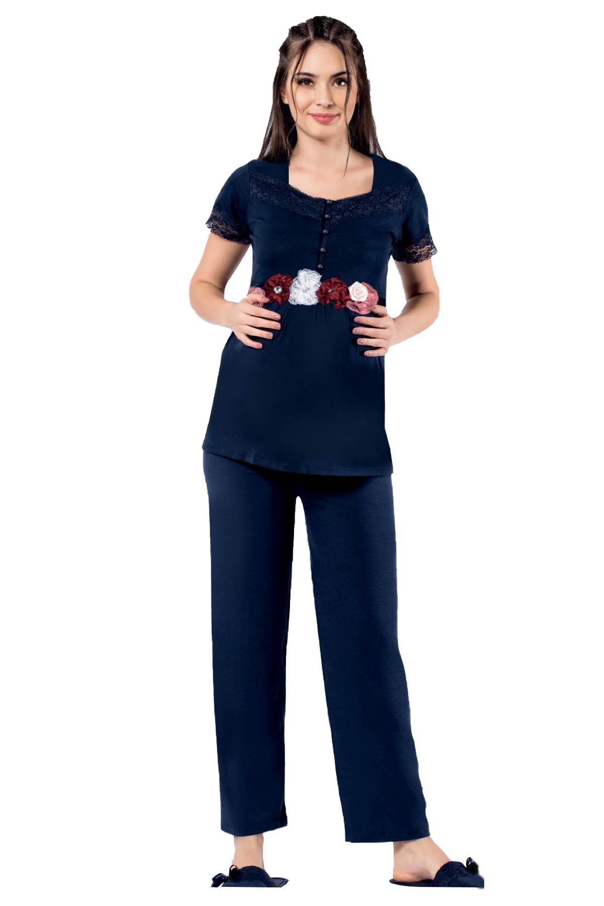 Lacivert Renk Kısa Kol Dantel Detaylı Sabahlıklı Lohusa Hamile Pijama Takımı Jenika 51719