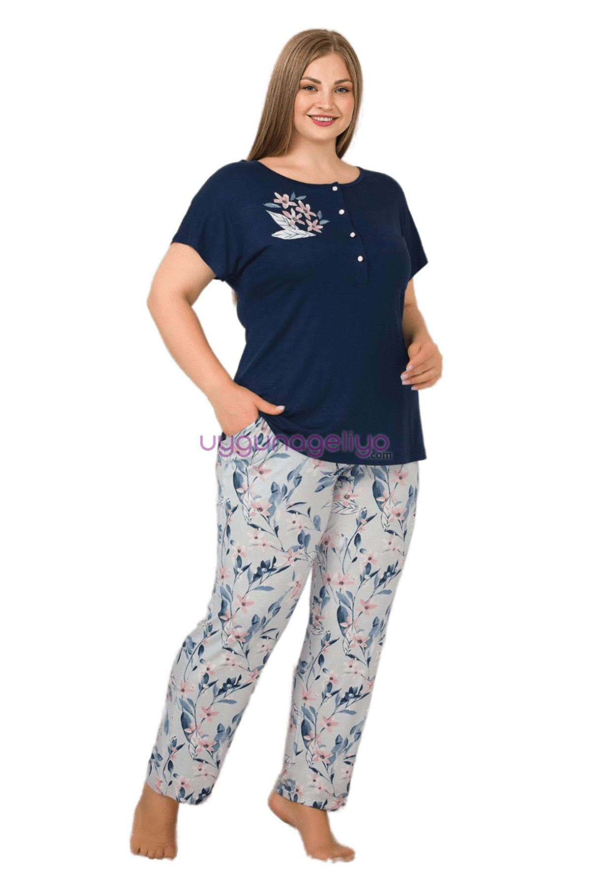 Lady 10901 Lacivert Renk, Çiçek Desenli Kısa Kol, Büyük Beden Penye Pijama Takımı