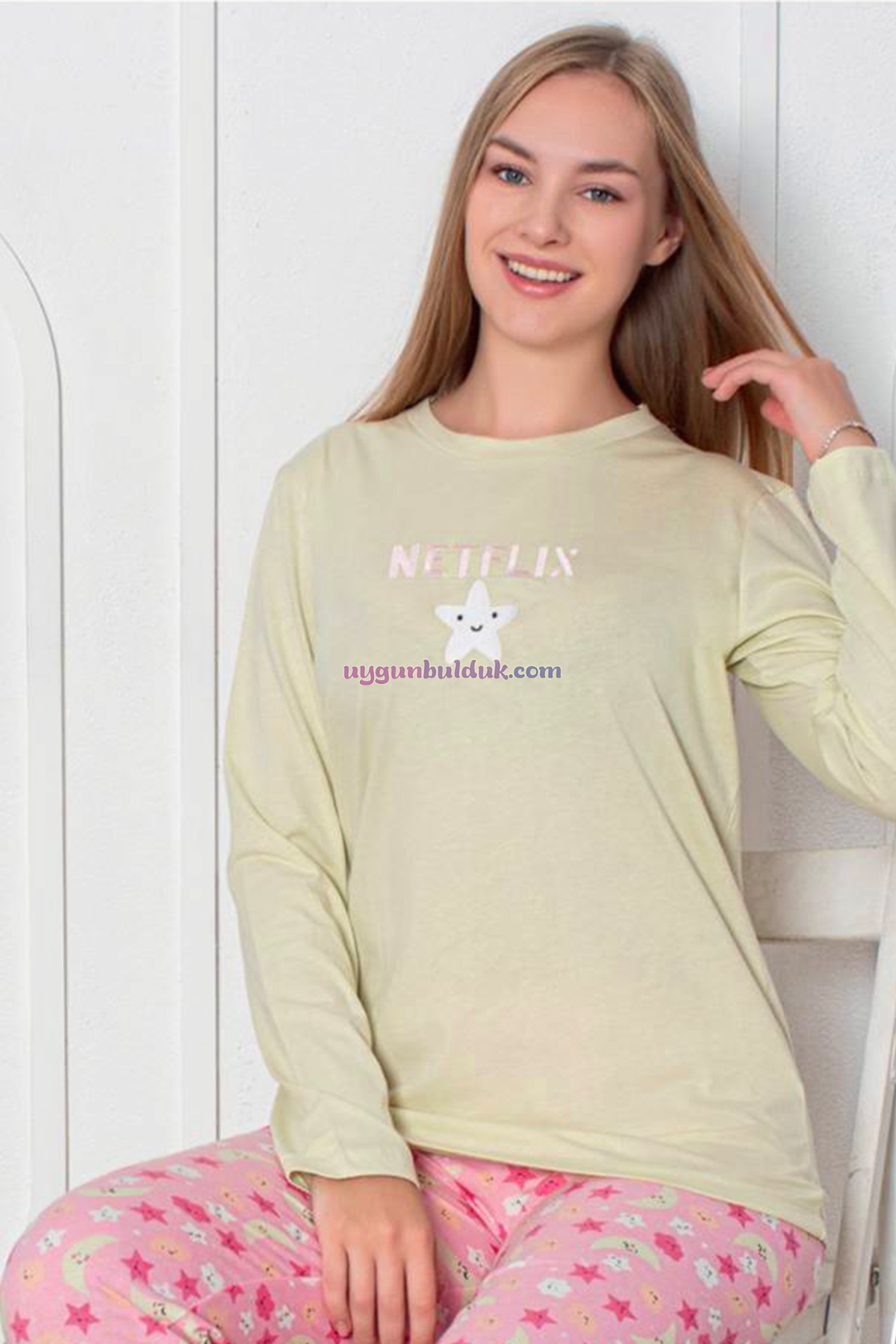Sarı Renk, Bisiklet Yakalı, Uzun Kollu ve Pamuklu Kumaş Teknur 2207 Kadın Pijama Takımı