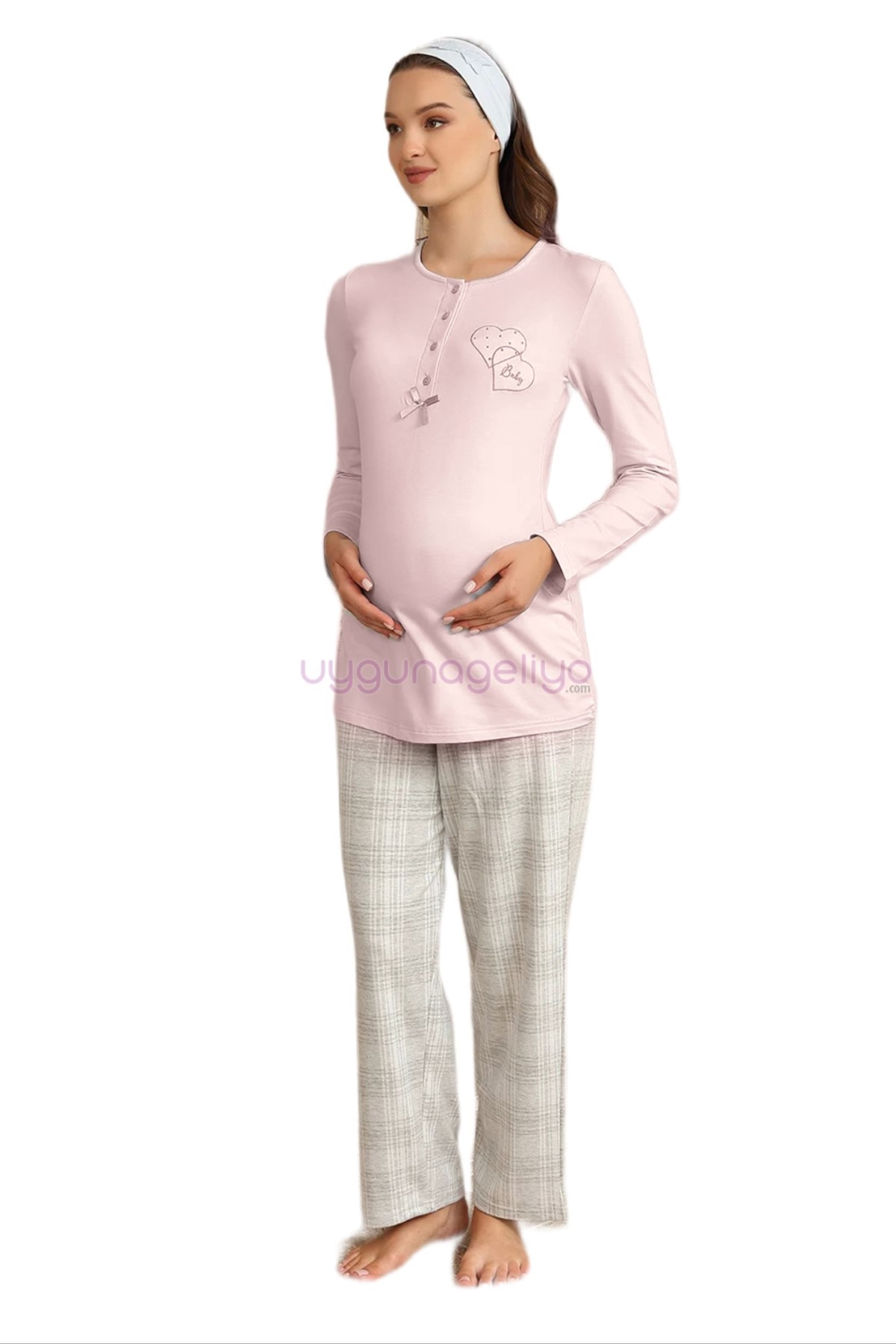 Bebe Pembe Renk BAHA 4414 Uzun Kol 3'lü ve Ekose Sabahlıklı Hamile Pijama Takım Set