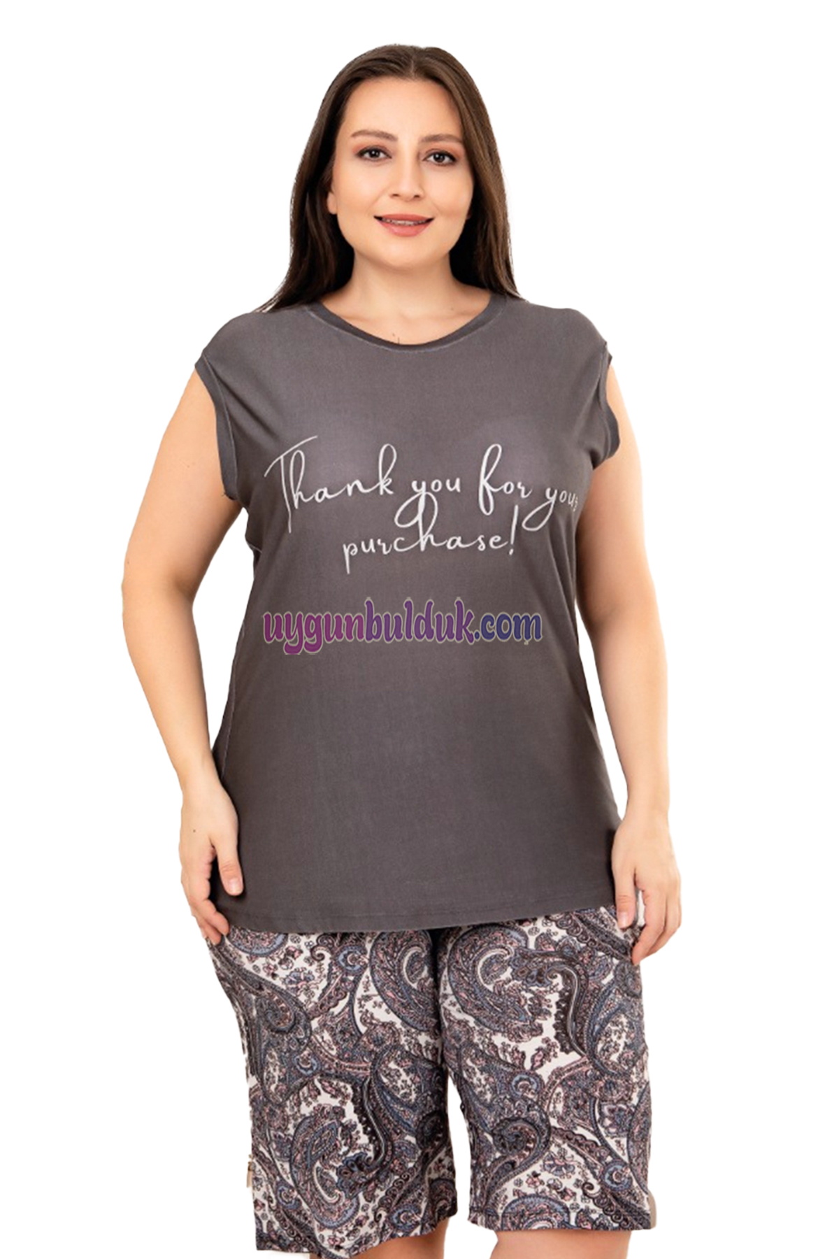 Rahat ve Şık Kadın Lady 10414 Çiçek ve Şal Desenli Füme Renk Büyük Beden Şortlu Anne Pijama Takımı