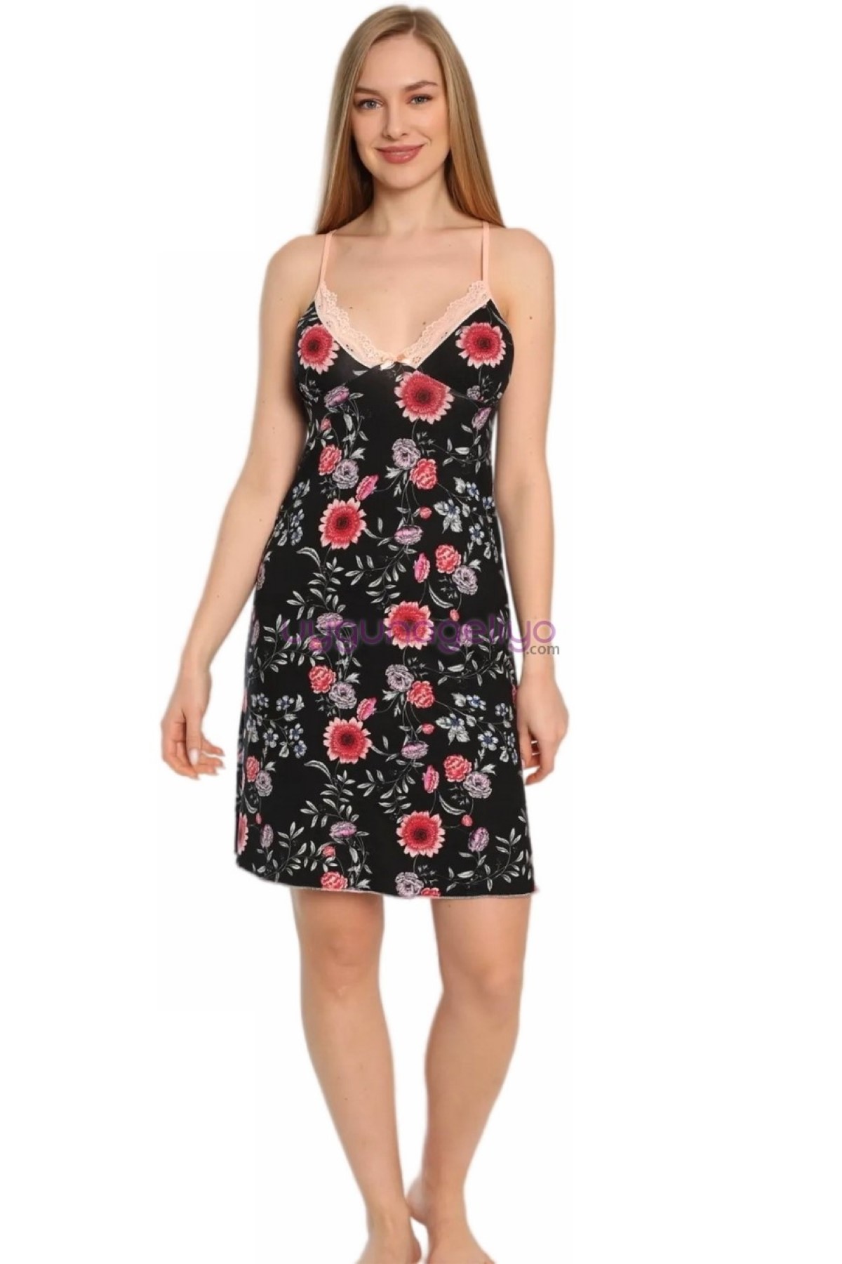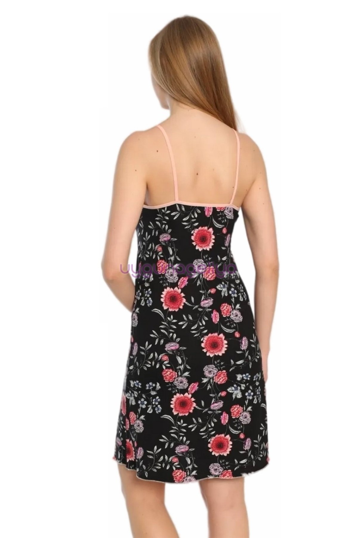Siyah Renk, Çiçek Desenli ve İnce Askılı Kol Jenika 52007 Tunik Gecelik