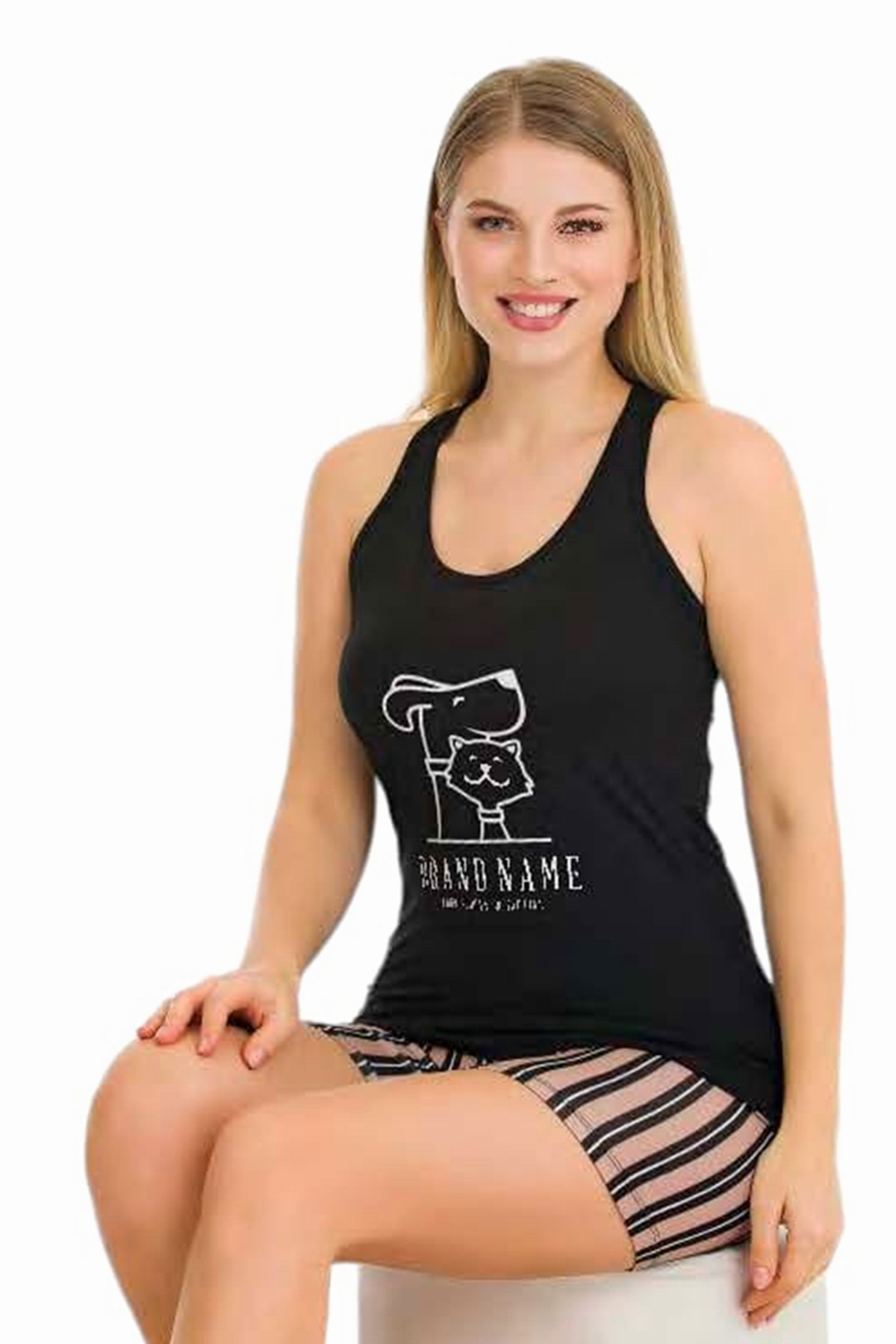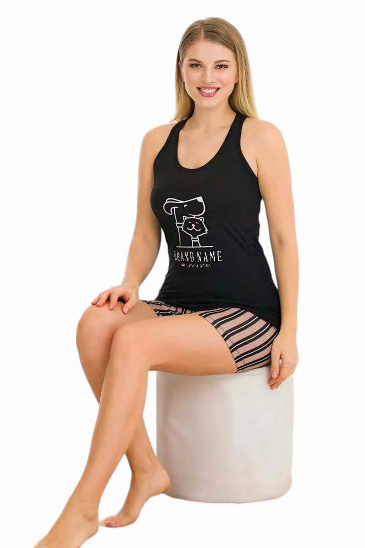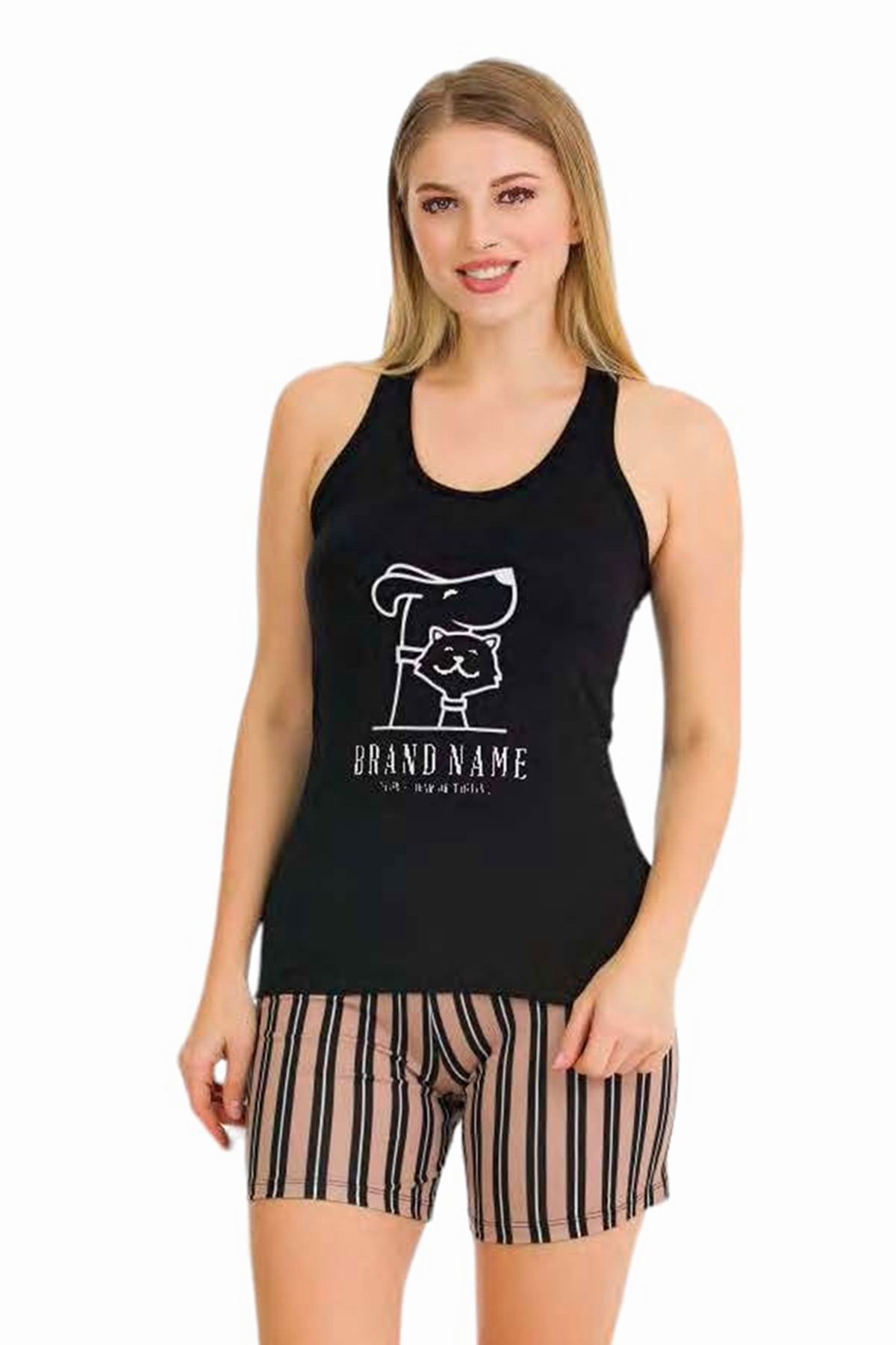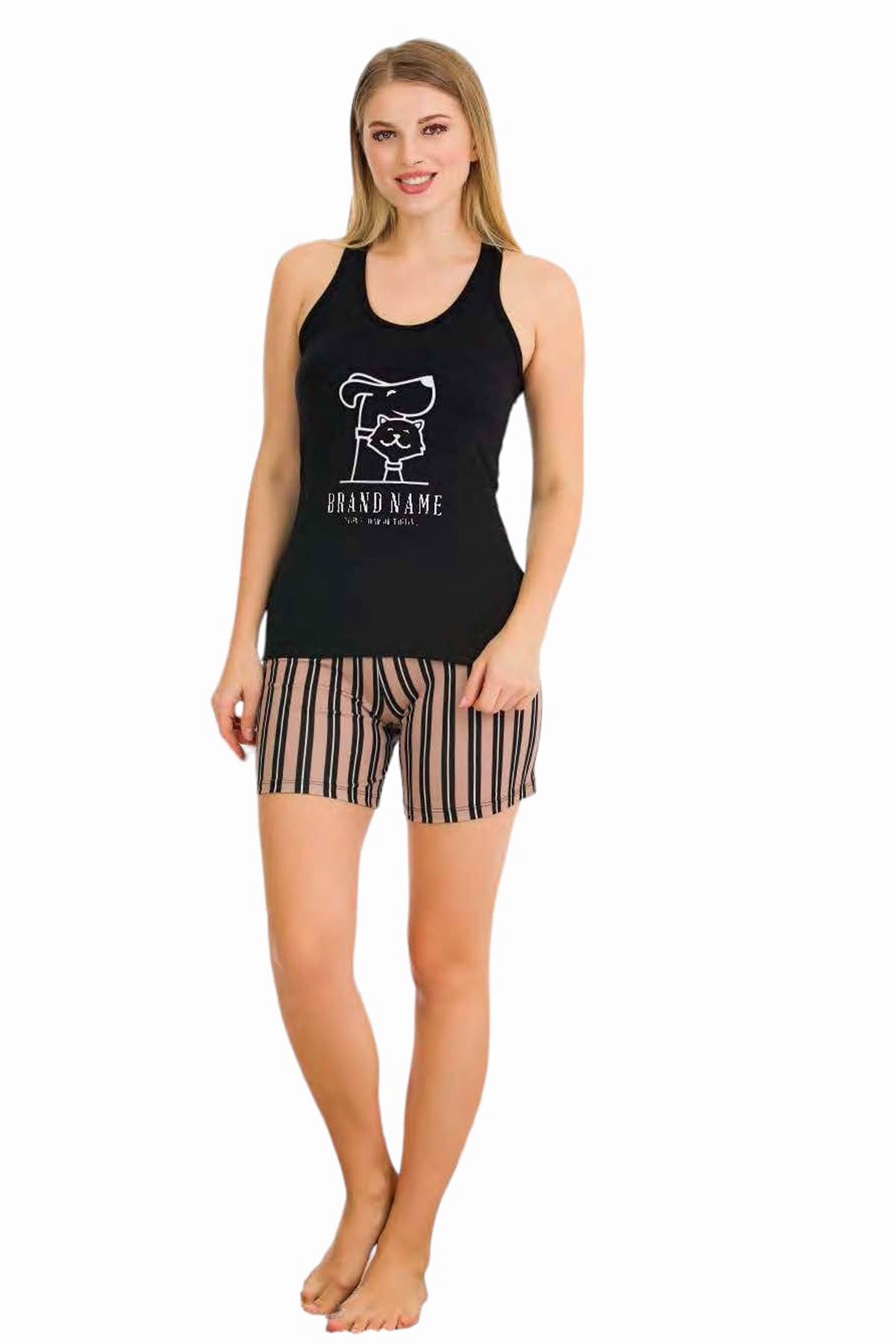 Lady 7711 Siyah Renk, Çizgili Desen Askılı Kol ve Şortlu Penye Pijama Takımı